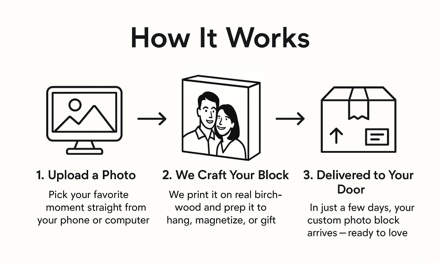 Your photos are printed on high quality paper and mounted on a solid birchwood block (4”x4”x3/4”). They’re shipped right to your door and—right out of the box—your photo blocks are ready to hang.