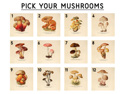 Set of 12 - Mushroom Illustration Wall Art - 6" x 6" Photo Blocks