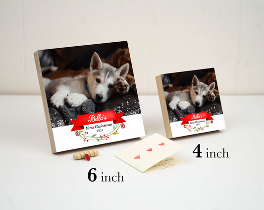 Personalized First Christmas Frame - 4" or 6" - Wood Photo Block - Dog Lover Gift - Custom Dog Ornament